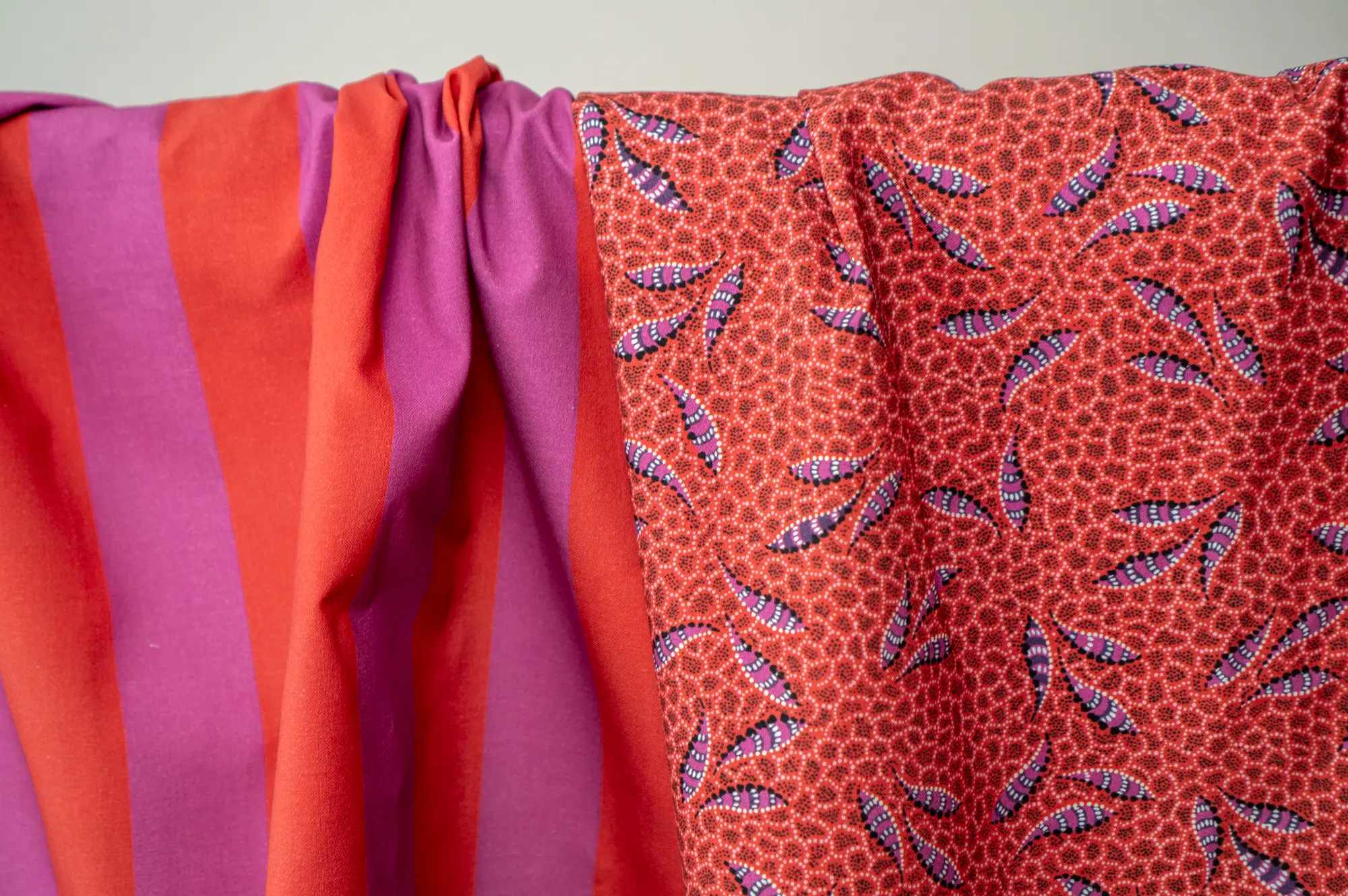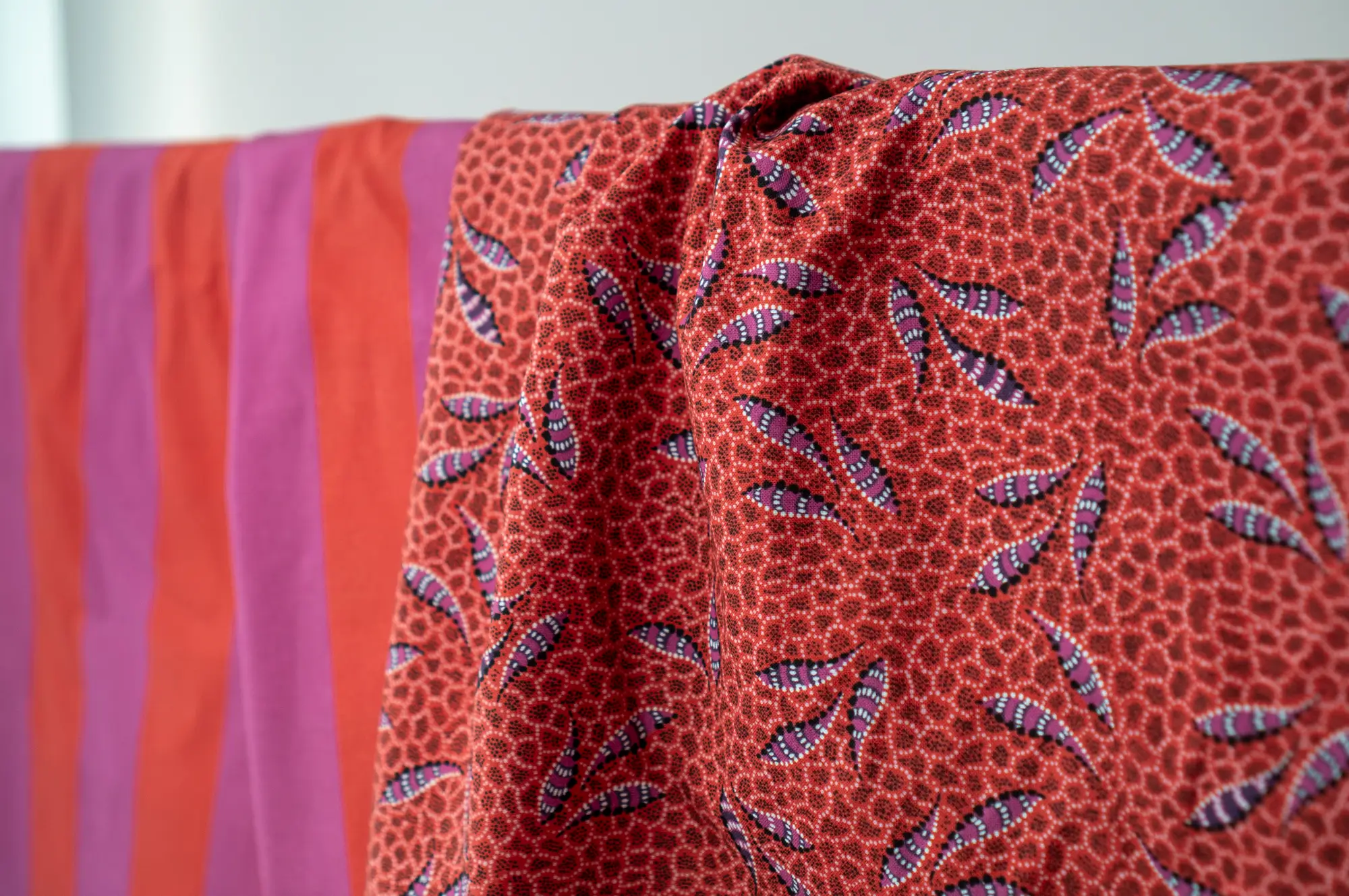 La déclinaison Rouge Rose du motif Batik mise sur une palette chaleureuse et vibrante qui évoque les feuillages d’automne. Les tons rouge, rose et bordeaux créent une profondeur visuelle accentuée par le travail en pointillés du fond.