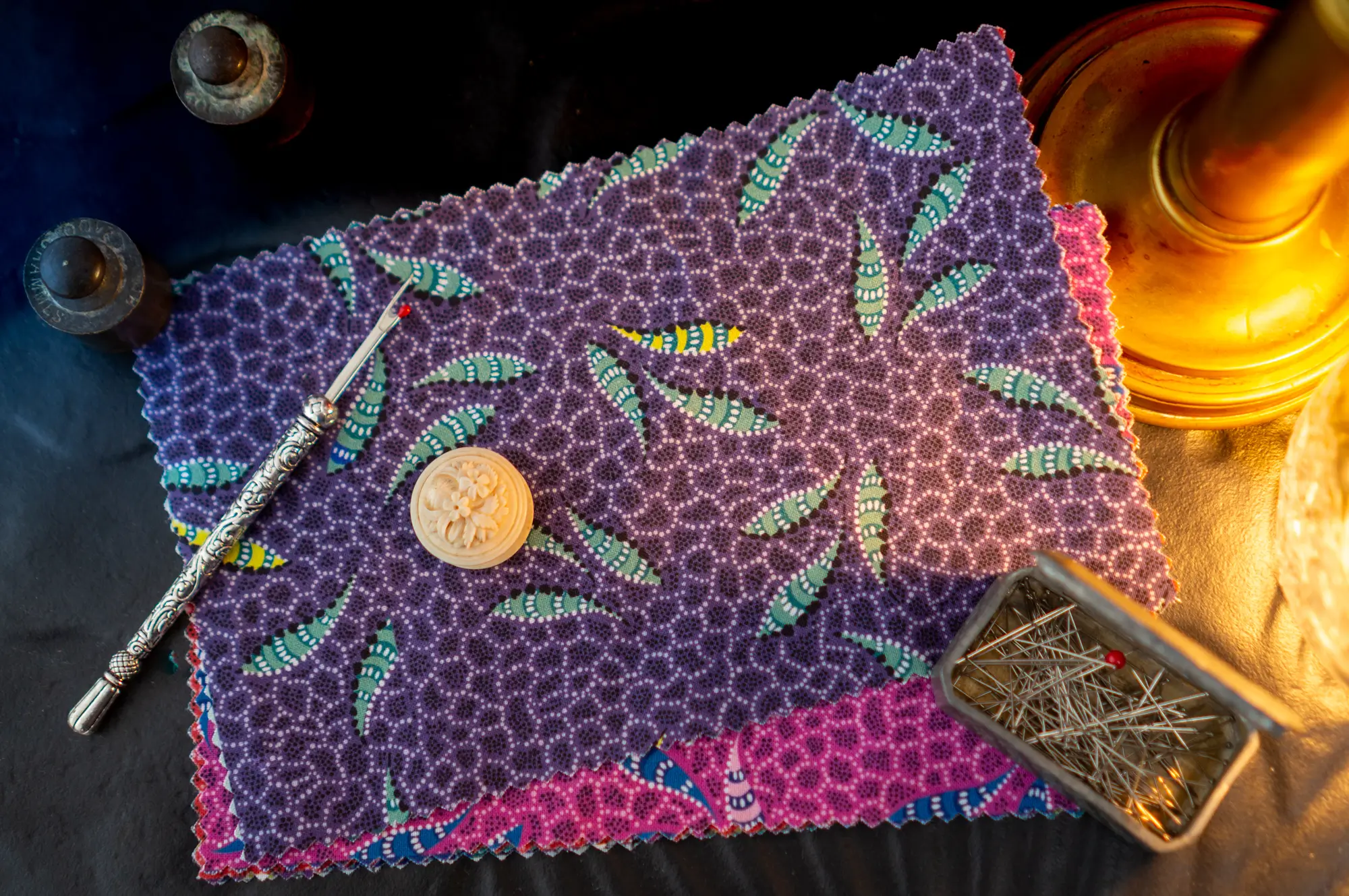 Ce dessin rappelle fortement les batiks indonésiens traditionnels, reconnaissables à leur technique de pointillés caractéristique. Les formes semi-figuratives de Frédéric Millot, tracées à main levée, laissent une liberté d’interprétation : poissons en mouvement ou pétales déployés, chacun y pose sa propre interprétation.