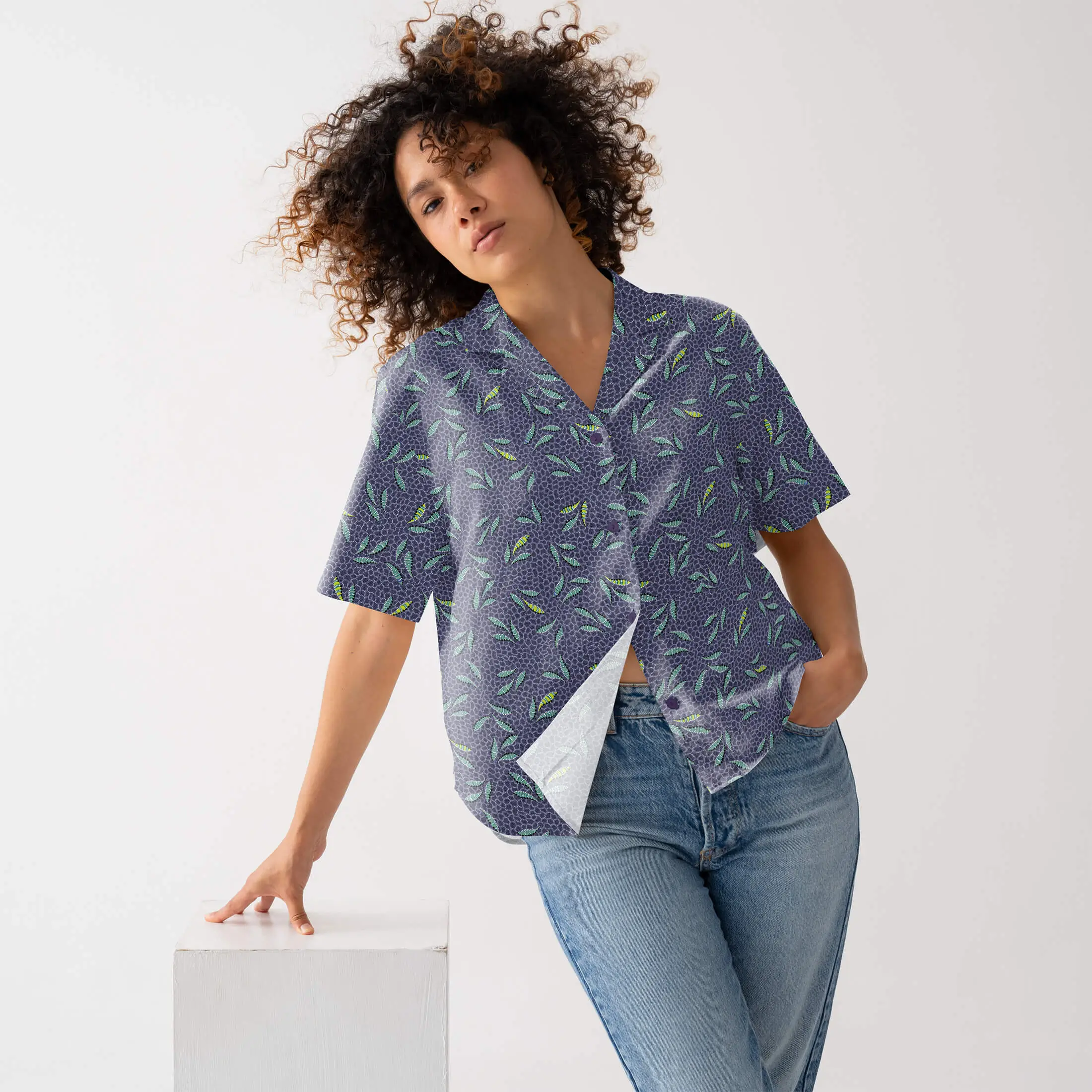 La déclinaison Violet du motif Batik se démarque par son audace chromatique. Le fond violet sombre est ponctué de turquoise et de jaune citron, créant des jeux de lumière inattendus. Cette palette sophistiquée fonctionne aussi bien sur des pièces légères (robes et blouses en satin ou percale) qu’avec des pièces plus cosy (pulls en French terry, vestes en toile panama).