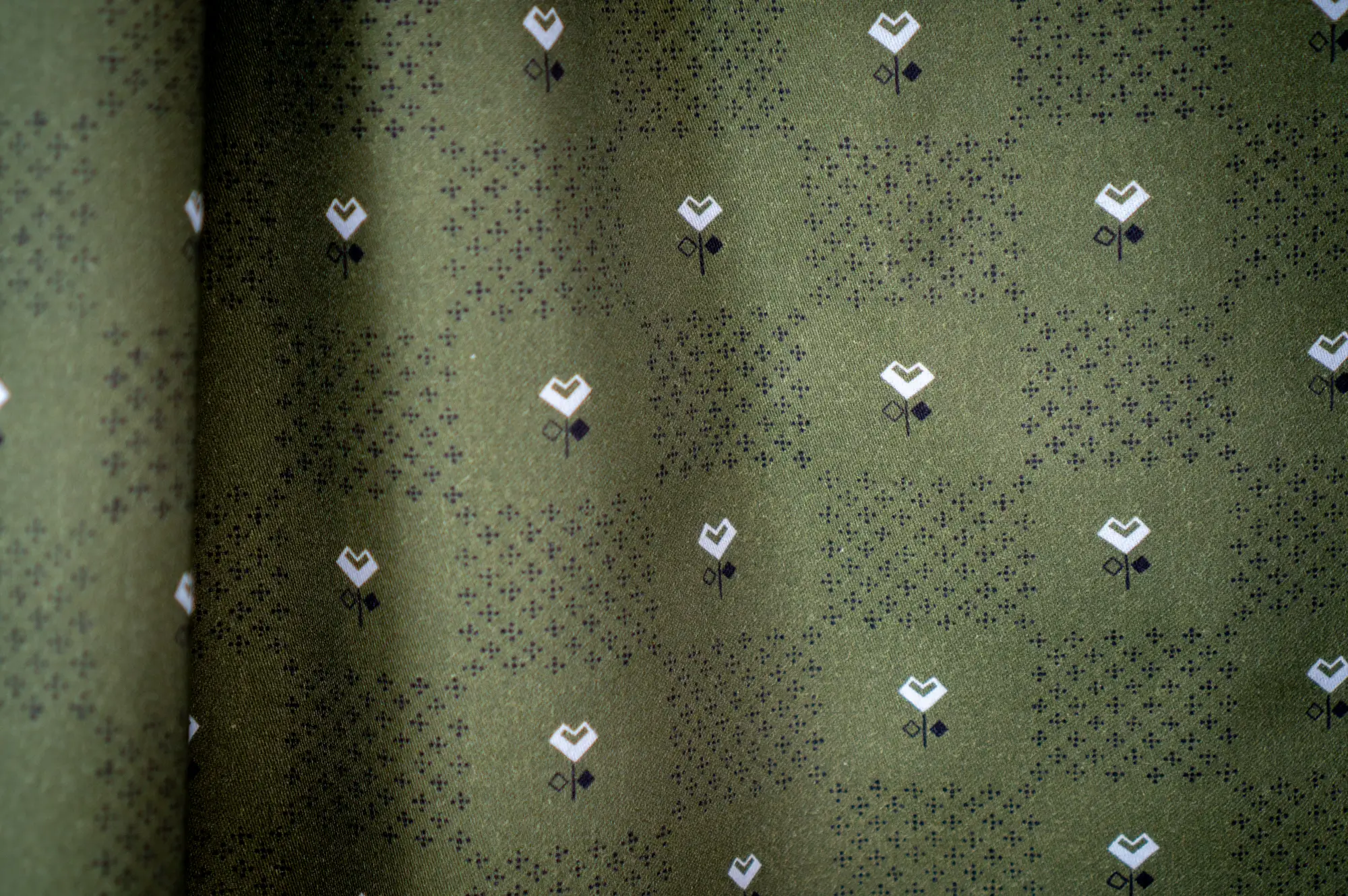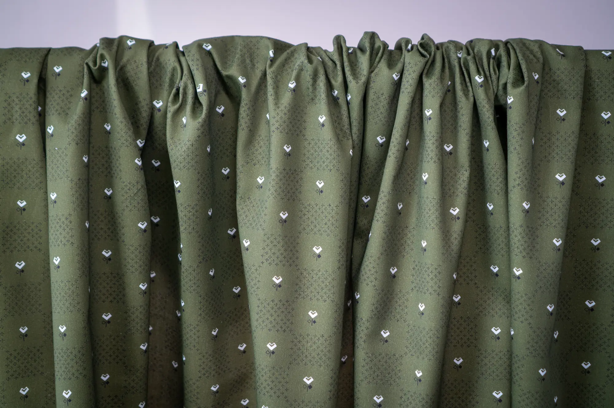 Le tissu Broderie Olive présente un damier de petites fleurs stylisées olive alternant avec des mini pois vert moyen sur fond vert printemps lumineux. Ce dessin textile des années 1920, signé Frédéric Millot, évoque l’esthétique des broderies traditionnelles au point de croix avec ses tiges vert moyen qui structurent la composition.