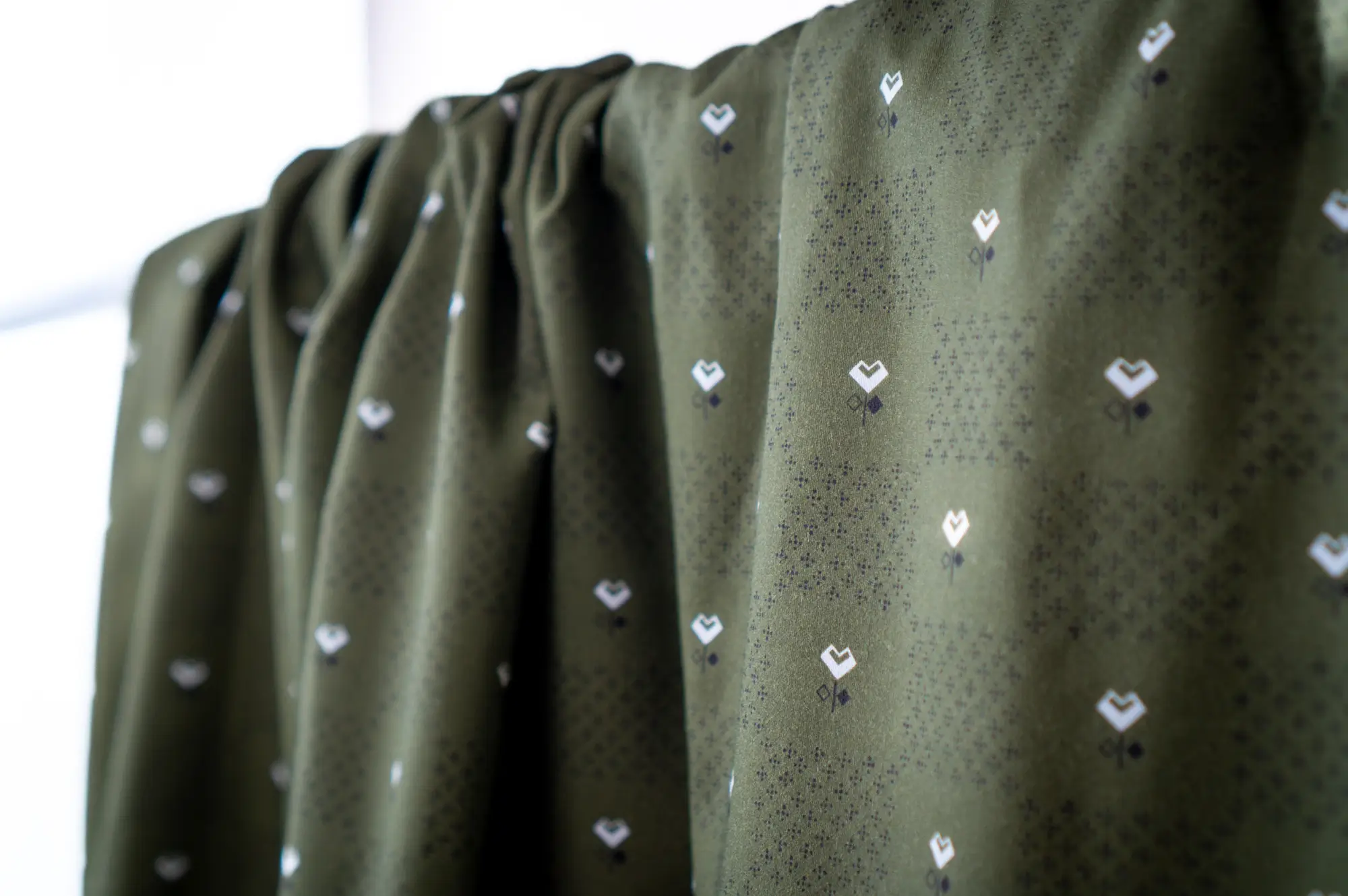 Le coloris Olive de la gamme Broderie mise sur les nuances végétales. Fond vert olive, fleurs blanches, tiges et pois noirs : une tonalité qui crée immédiatement une ambiance automnale toute en douceur.